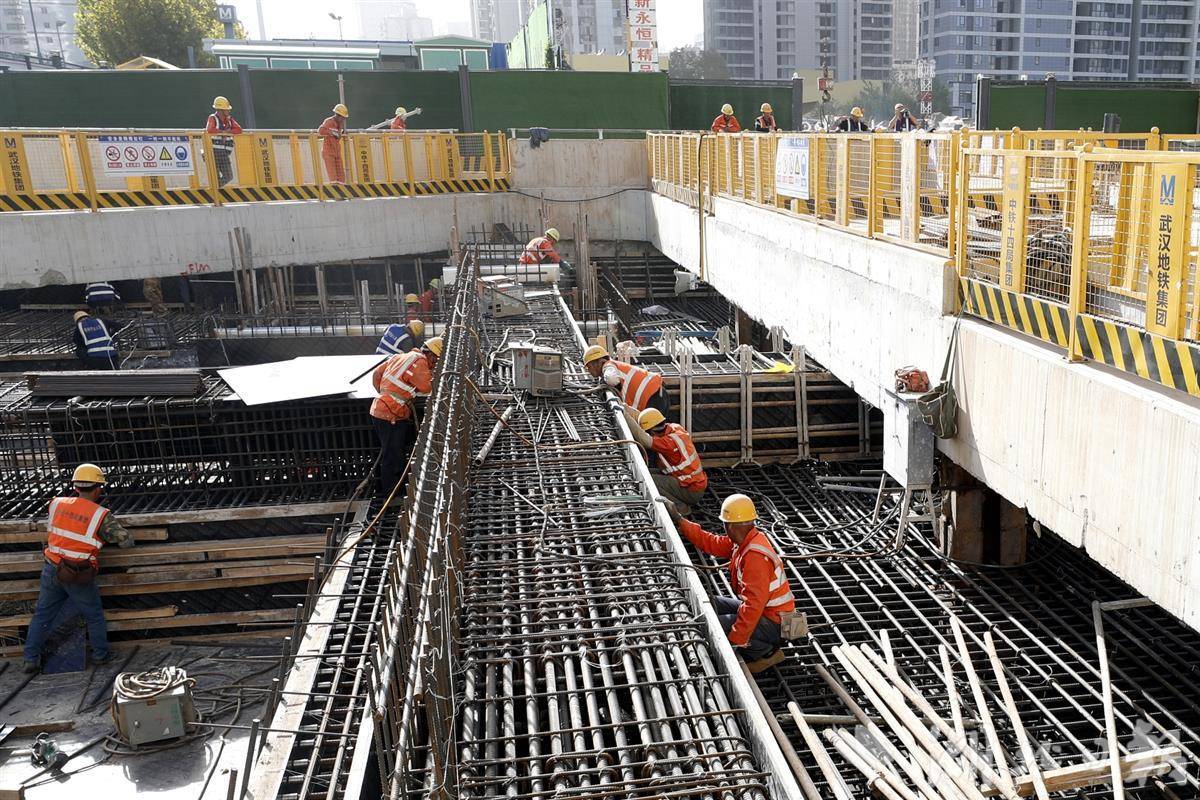 武汉地铁10号线于家头站主体结构已成功压陷。图为工人们加固屋顶、浇筑模板。湖北日报客户端记者 袁勇...