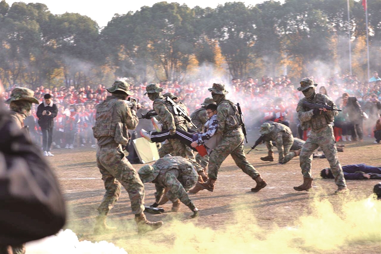 活动现场,实战演练率先点燃了观众的热情。随着“无人机搜索”命令下达,海军工程大学“蛟龙特种兵”俱乐部战术小分队迅速行动。抓俘、夺刀、反击等一系列动作快速猛烈,配合默契任命。专业而感人的表演引来现场观众的阵阵惊叹和掌声,让同学们直观地感受到了军校实战训练的硬核风范。