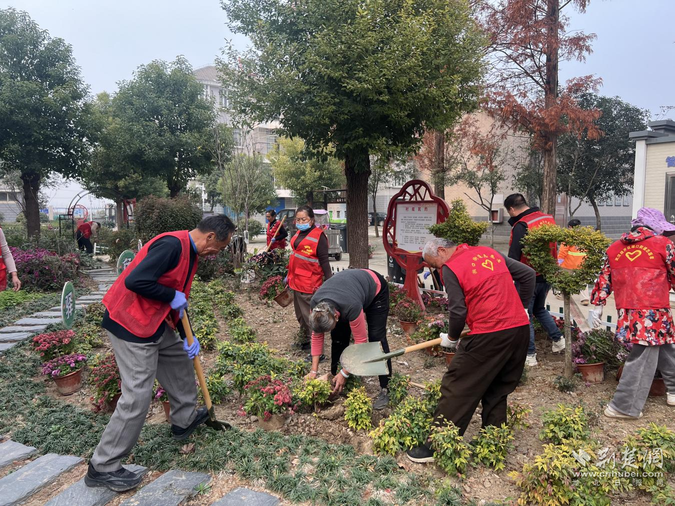 社区志愿服务队与沉浸党成员一起植菊。通讯员供图