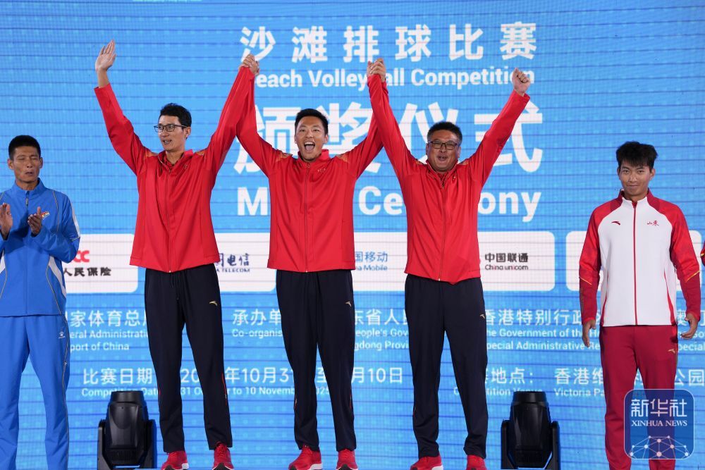 11月10日,第十五届全运会男子沙滩排金牌、铜牌争夺赛在香港举行。 ↑ 江苏队吴嘉欣(左二)/周超伟(中)与教练在颁奖典礼上。 ↑ 江苏队球员吴嘉欣(右)/周超伟赛后庆祝冠军胜利。金牌争夺战中,她们以2-0击败辽宁队李卓新/薛涛。 ↑ 江苏队球员吴嘉欣/周超伟(左)在比赛中。金牌争夺战中,她们以2-0击败辽宁队李卓新/薛涛。 ↑ 山东队球员王燕伟在比赛中庆祝得分。铜牌上他与搭档杜红军以2比0击败上海队的洪家俊/李杰,获得季军。 ↑ 辽宁队球员李卓新(右)在比赛中。他和队友薛涛在金牌争夺战中以0-2不敌江苏队吴嘉欣/周超伟,获得第二名。 ↑ 比赛中的辽宁队球员薛涛(右)e.他与搭档李卓新在金牌争夺战中以0-2不敌江苏队吴嘉欣/周超伟获得亚军。 ↑ 辽宁队球员李卓新在比赛中扣球失误。他和队友薛涛在金牌争夺战中以0-2不敌江苏队吴嘉欣/周超伟,获得亚军。 ↑ 获得银牌的辽宁队球员薛涛(左)看着江苏队的金牌得主吴嘉欣。 ↑ 上海队球员李杰(右)在比赛中。他与搭档洪家军0-2不敌山东队王燕伟/杜红军获得铜牌。 ↑ 上海队球员李杰(右)在比赛中。他与搭档洪家军以0-2不敌山东队王彦伟/杜红军获得铜牌。新华社记者 吴璐 摄 上一篇:十年的努力,取得了丰硕的成果。中新(重庆)